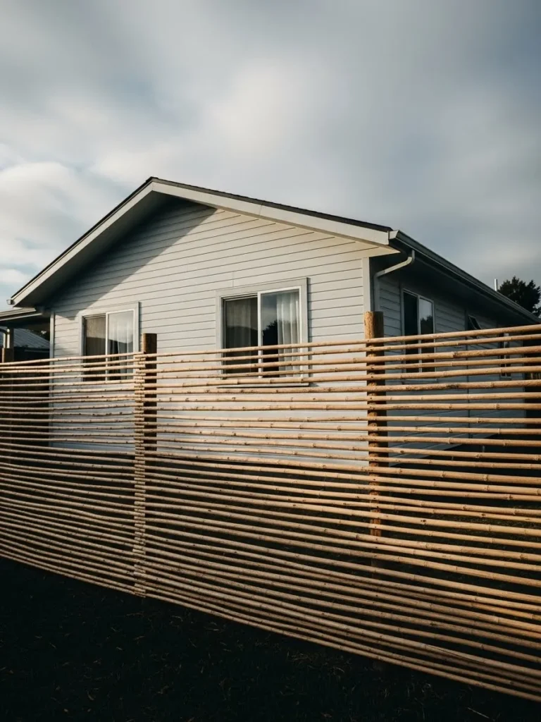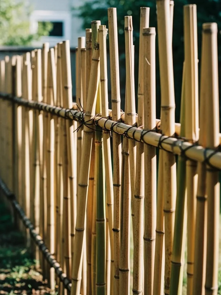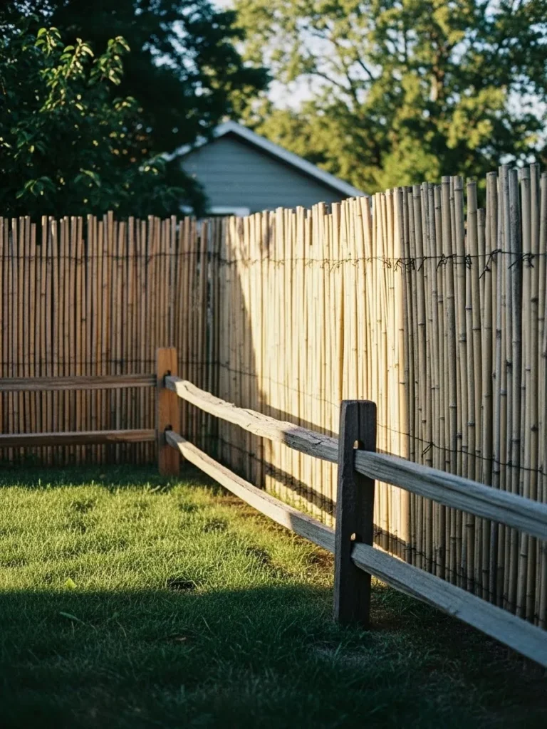 This fence uses closely placed bamboo canes tied together to create a tall, natural-looking barrier. The soft golden tones catch the sunlight beautifully and add warmth to the yard. Paired with a simple wooden rail and green grass, it feels calm, relaxed, and surprisingly private for such an affordable material.
