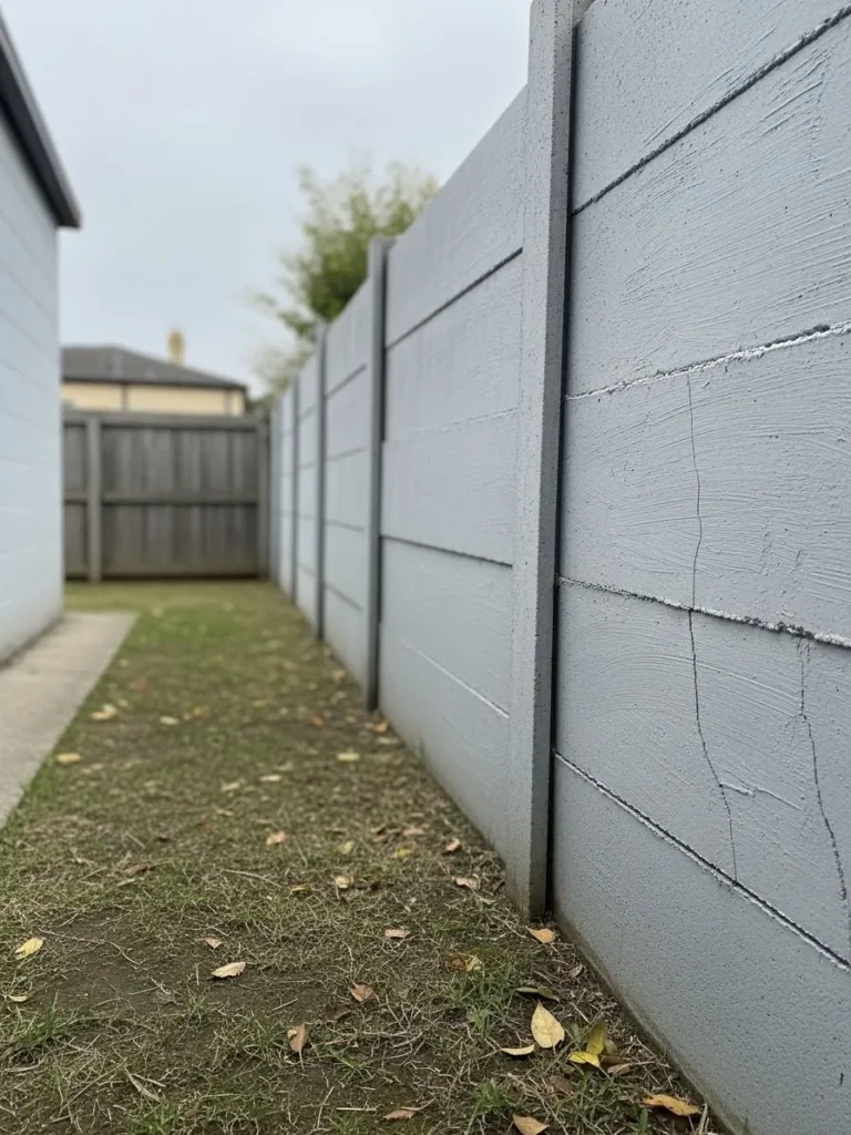 This fence is made from solid concrete panels painted in a soft gray shade. The smooth surface and straight lines give it a clean and minimal look that fits perfectly alongside the house. It creates strong privacy while keeping the space feeling orderly and uncluttered.
