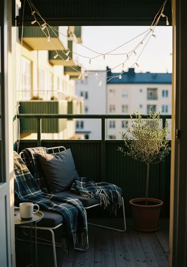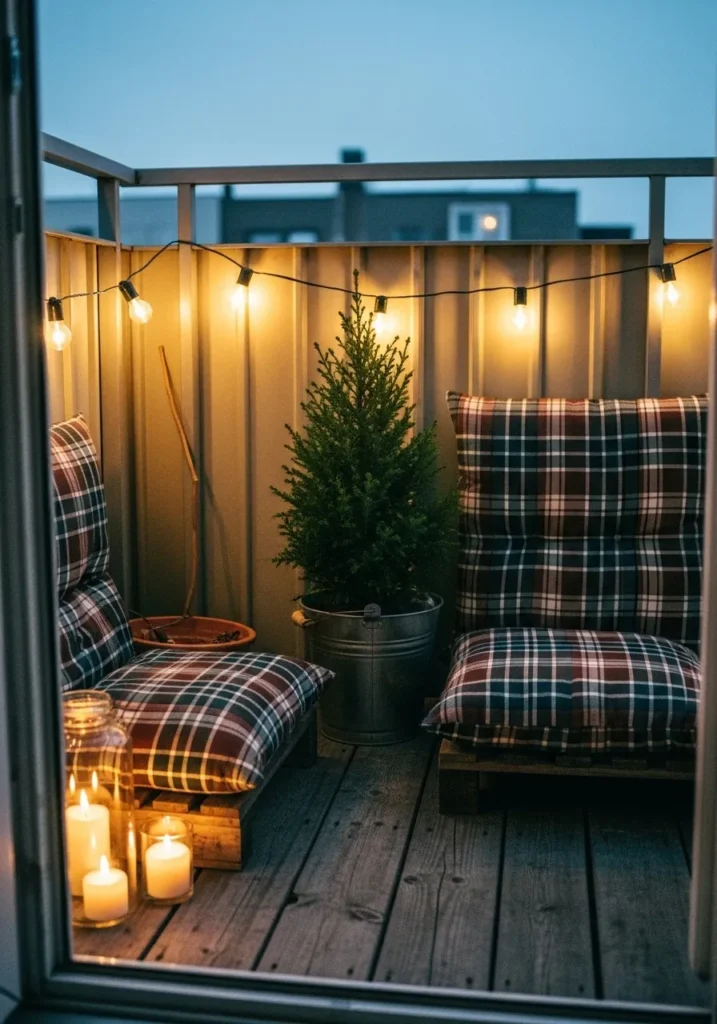 Here’s a perfect example of how a tiny balcony can become your favorite winter nook. A couple of string lights overhead, a cozy plaid throw, and some soft pillows instantly transform this space into a holiday hideaway. The potted plant adds a fresh touch of green that feels festive without any effort. Even better, the natural light bouncing off the buildings gives it that dreamy golden-hour glow.