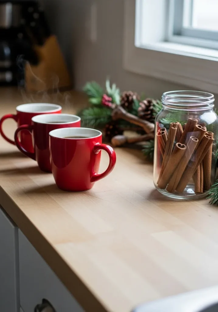 Three red mugs steaming with hot cocoa line a kitchen counter, beside a jar filled with cinnamon sticks and a little greenery. It’s such a simple setup, yet it immediately feels festive and full of warmth. The pops of red and the scent of cinnamon create that instant cozy Christmas atmosphere.