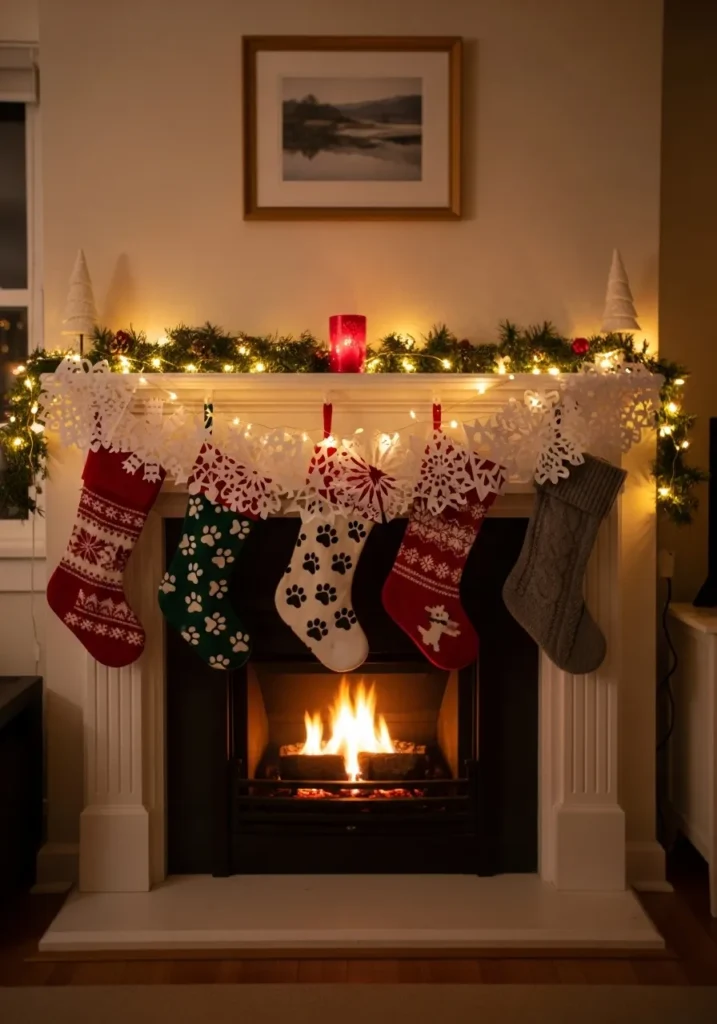 Nothing says Christmas like a cozy fireplace draped with stockings and twinkling lights. This design keeps it classic with a garland of greenery, white paper snowflakes, and a mix of red, green, and gray stockings that feel perfectly mismatched in the best way. The soft glow from the fire below ties it all together beautifully.