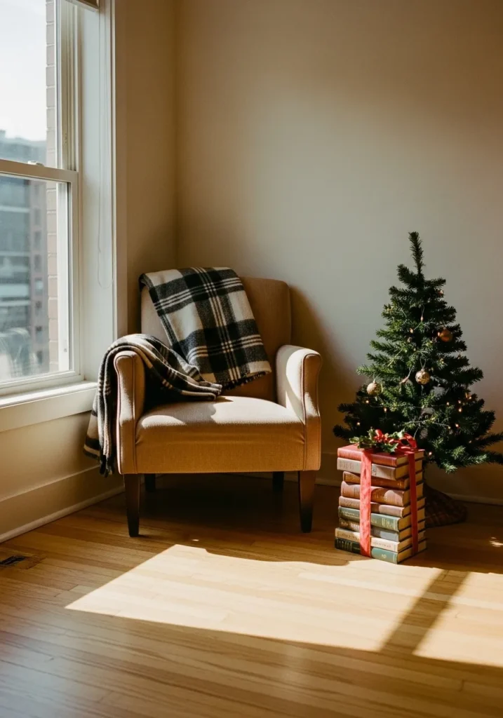 This setup captures that calm and heartwarming holiday feeling we all crave. A soft beige armchair draped with a cozy plaid blanket sits by the window, soaking in the winter sunlight. Next to it, a small Christmas tree sparkles with gold ornaments, resting on a creative base made of stacked books tied with a red ribbon. It’s charming, thoughtful, and wonderfully resourceful.