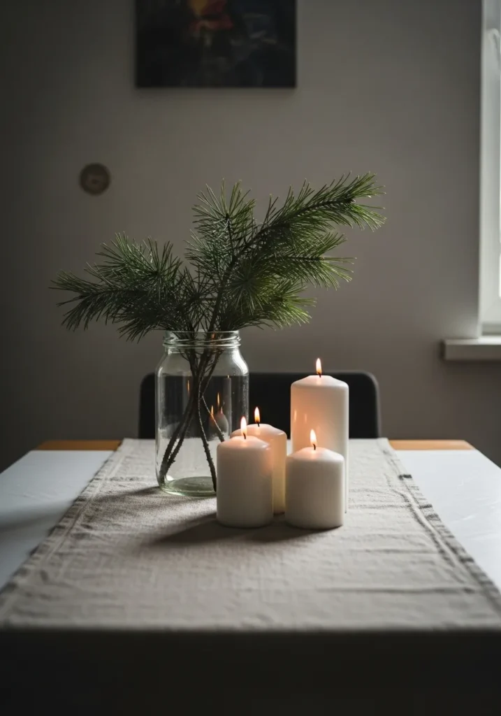 This simple table design is all about natural beauty and balance. A clear glass jar holds a few pine branches, paired with softly glowing pillar candles arranged on a linen runner. The light plays beautifully against the muted tones, creating a calm and inviting holiday atmosphere that feels pure and peaceful.