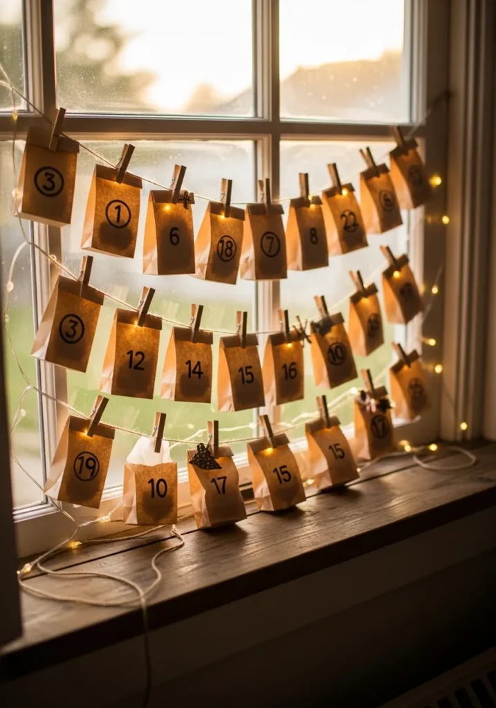 This creative advent calendar brings so much personality and charm to a simple window. Brown paper bags numbered from one to twenty-four hang on twine with tiny clothespins, glowing softly with warm fairy lights. It’s a fun and nostalgic idea that turns anticipation into part of your decor.