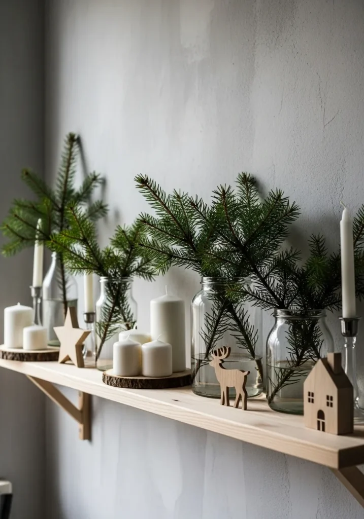 This beautiful shelf display combines Scandinavian simplicity with Christmas coziness. Glass jars filled with pine branches sit alongside candles, small wooden figures, and star accents. The mix of natural textures and muted tones gives it a calm, modern look that feels perfectly festive without any clutter.