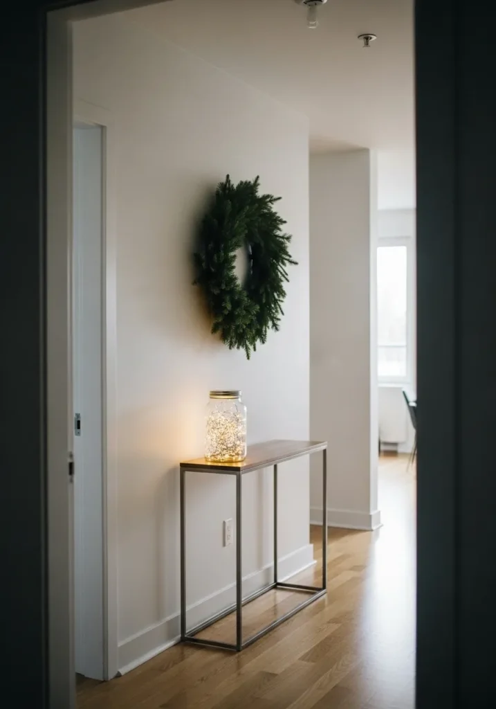 This minimalist hallway setup proves that even small spaces can shine for the holidays. A simple wooden console table holds a glass jar filled with fairy lights, while a lush green wreath adds texture and warmth to the wall above. The soft lighting creates a welcoming, golden glow that feels both modern and cozy.