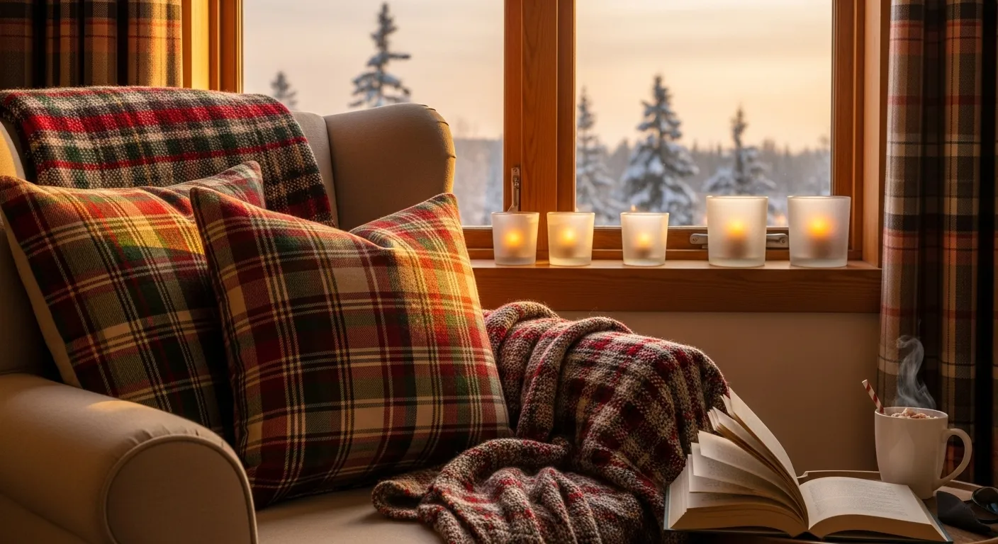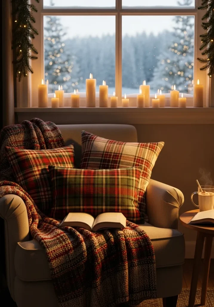 Nothing feels cozier than a plaid-filled nook lit by the glow of candles. This setup features a comfy armchair piled high with red-and-green plaid pillows and a matching throw, framed by a window lined with flickering candles. Snowy trees outside complete the picture, making it the ultimate winter retreat.
