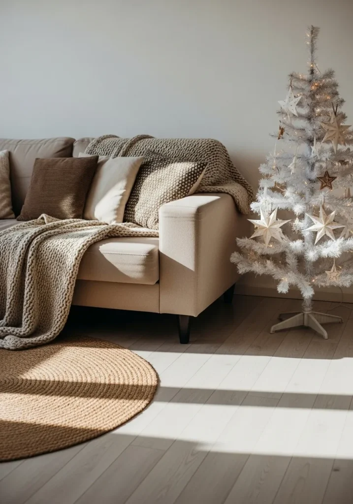 This soft, sunlit living room keeps things simple and sophisticated with a palette of beige, cream, and light brown. A white Christmas tree decorated with paper stars adds a dreamy, modern touch. Cozy knit blankets and textured pillows make the whole space feel like a calm winter sanctuary.
