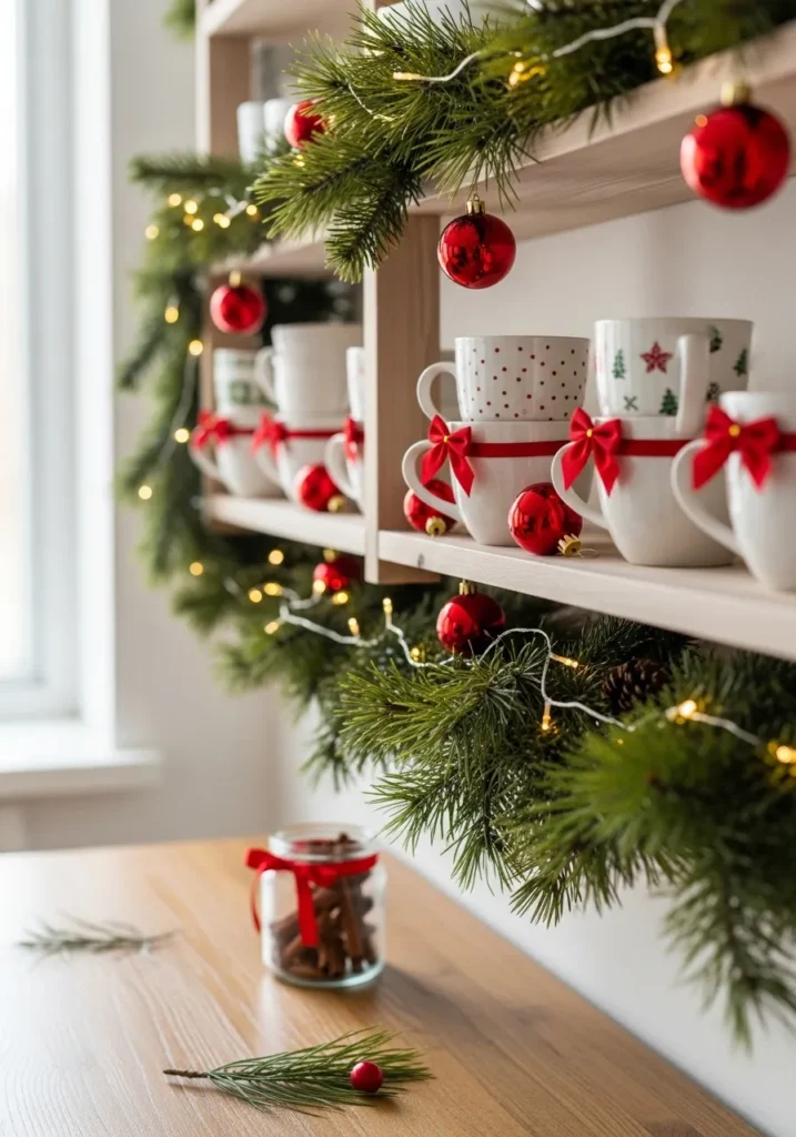 This idea just makes me smile because it’s so personal and charming. I love that it’s both decorative and functional—every cup tells its own story, and those pops of red bring so much cheer. It’s the kind of setup that makes your whole kitchen feel merry without spending much at all.