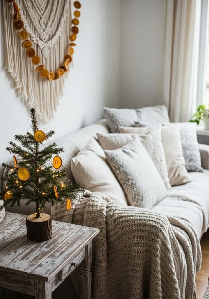 This setup is all about warm textures and natural beauty. A small Christmas tree decorated with dried orange slices sits on a rustic wooden side table beside a soft, neutral-toned sofa covered in chunky knits and plush pillows. The macrame wall hanging ties the whole cozy-boho vibe together, creating a perfectly inviting holiday space.