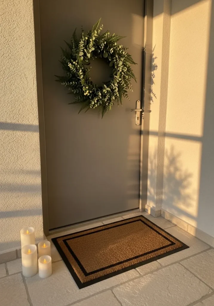 A fresh green wreath and a few glowing candles by the door make this entryway feel festive in the most understated way. The soft afternoon light adds a golden warmth that makes the entire setup glow. There’s no glitter, no fuss—just timeless elegance that whispers “welcome home” with a touch of Christmas spirit.