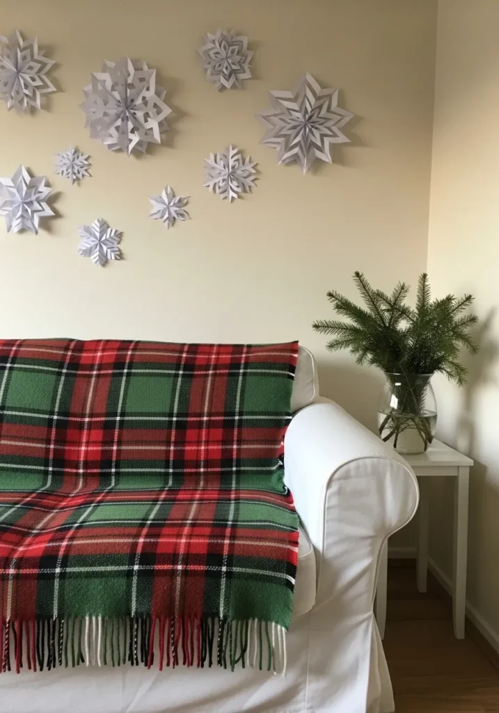 Nothing says festive creativity like handmade paper snowflakes on the wall. This design pairs simple white paper cutouts with a red-and-green plaid throw, instantly creating that classic Christmas feel. The cozy white sofa and a vase of fresh pine branches make it all come together in the sweetest way.