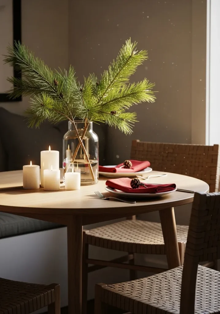 This cozy dining nook keeps things wonderfully minimal with a few pine branches in a clear glass vase, surrounded by soft candlelight. The red napkins tied with pinecones add a pop of color that instantly makes the setup feel festive and inviting. Everything feels warm and natural, like the kind of table where good food and long conversations happen.