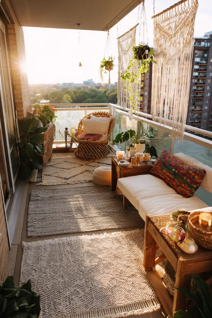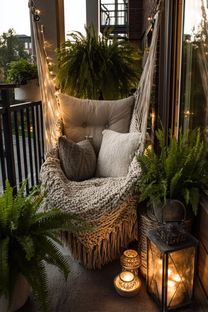 This tiny balcony proves that even the smallest outdoor space can feel like a lush, private retreat. The main feature is a macrame hammock chair hung high, piled with soft throw pillows in neutral tones like cream and gray for maximum comfort. Surrounding the seating area is a canopy of ferns and hanging greenery creating a jungle-like vibe and offering natural shade and privacy. The lighting is absolutely key here with delicate string lights twinkling overhead and warm lantern light scattered on the deck for an intimate, magical glow after dark.