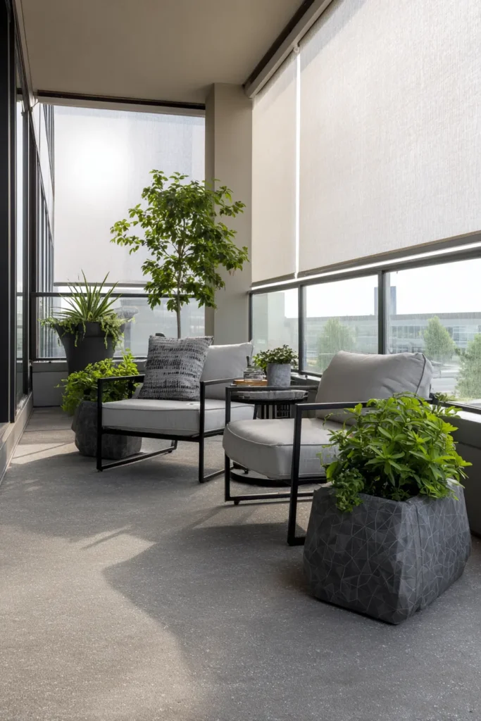 This modern design is all about clean lines, clever use of space, and controlling the elements with a stylish retractable roller shade for adjustable privacy and sun protection. The furniture is mid-century modern inspired with slim, charcoal gray chairs and simple side tables. The flooring is a wide-plank, light gray tile that keeps the look fresh and minimal. A standout feature is the use of a single, small decorative tree in a sculptural planter, which adds a beautiful organic contrast to the sleek architecture.