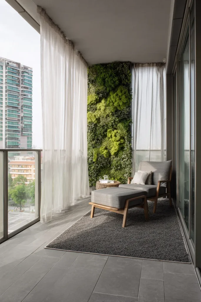 This super-sleek, narrow balcony is transformed into a serene escape thanks to an incredible full-height vertical garden wall that completely dominates the space. The flooring and interior walls are kept simple with matching dark gray tiles, which highlight the vibrant green texture of the living wall. Simple, minimalist furniture—like a single, modern lounge chair—is placed to face the greenery, turning the plants into the main focal point and view. Tall, sheer curtains soften the glass doors and add a touch of drama.