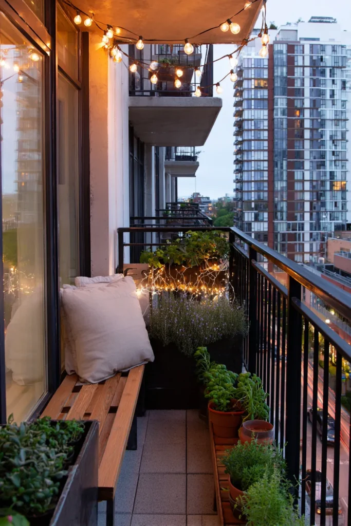 This charming balcony is a masterclass in creating a warm, inviting atmosphere with practical touches and ambient lighting. A long, wooden bench provides ample seating, softened with a fluffy white pillow, perfect for lounging. The railings are adorned with planter boxes overflowing with herbs and small plants, adding a delightful touch of nature and a fresh scent to the air. The true magic happens overhead with multiple strands of bistro lights crisscrossing the space, casting a soft, romantic glow that makes the entire area feel incredibly cozy and enchanting after dark.