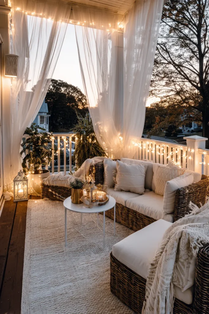 Everything about this space is just utterly romantic and gives off the most delightful Boho-chic vacation vibes—I am obsessed! The sheer curtains are an absolute game-changer for adding instant privacy and that soft, glowing atmosphere that feels straight out of a magazine. It is the perfect cozy retreat for anyone who loves layering textures and wants their outdoor space to feel like a complete, beautiful sanctuary.