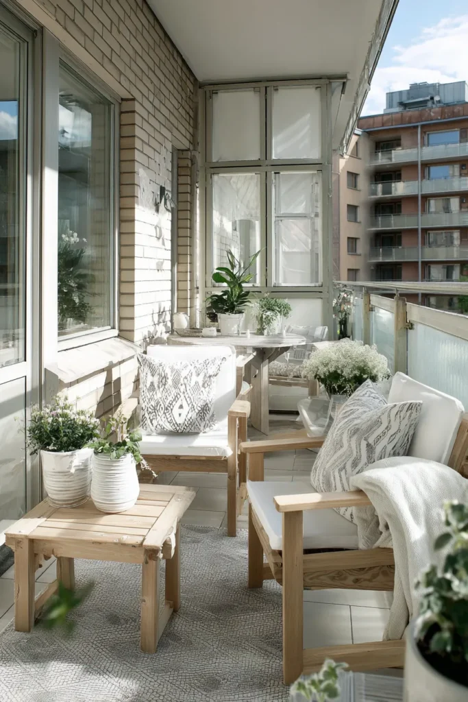 This bright, airy balcony embraces a charming shabby-chic style with its light wood tones and a focus on layered comfort. The space is furnished with simple wooden chairs and tables, all painted or stained in light, natural colors. Comfort is prioritized with white throw blankets, pillows, and soft fabrics draped everywhere, giving it a relaxed, lived-in feel. Small white planters filled with greenery and white flowers complete the idyllic, cottage-in-the-city aesthetic.