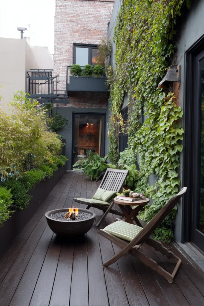 I absolutely adore how this design brings such a high level of sophistication and coziness to an outdoor space, especially with that beautiful fire pit feature. The contrast between the dark wood and the vibrant green ivy is just breathtaking, making the entire area feel like a hidden garden carved out of the city. It is the ultimate spot for unwinding after a long day or hosting a super intimate gathering—it feels like such an expensive, custom touch for apartment living.