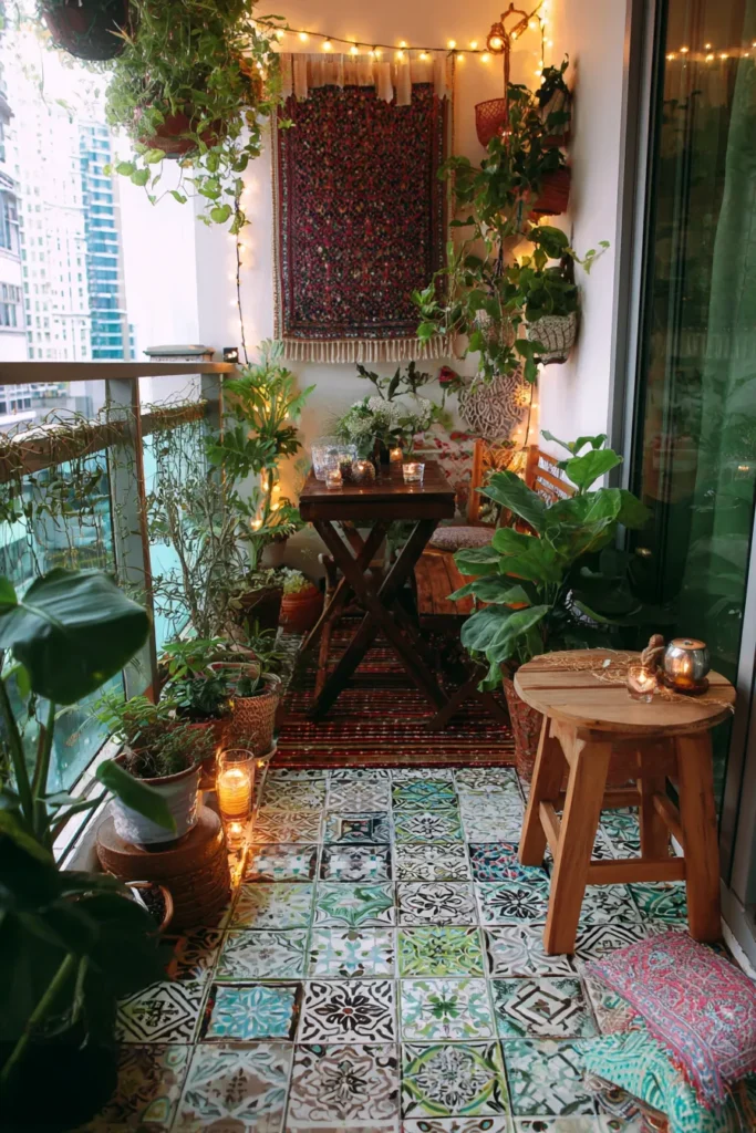 This small balcony is bursting with personality, using layers of texture, color, and pattern to create a vibrant, exotic hideaway. The floor is covered in ornate, multicolored patterned tiles or a rug, instantly setting a global, bohemian mood. A folding wooden bistro table and a small, rustic side stool are nestled amongst an abundance of lush plants and hanging greenery. The space is topped off with a mix of string lights and a colorful tapestry hung on the wall, adding a cozy, handcrafted touch.