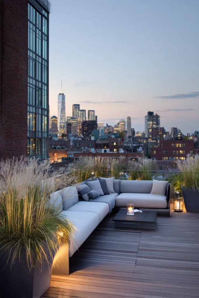 Gosh, this terrace is pure goals—it is the ultimate dream of stylish, high-end apartment living because it feels like a private, chic outdoor club. I love how the comfortable sectional seating invites everyone to lounge, and the tall, feathery grasses add such a beautiful, organic contrast to the sharp lines of the cityscape. It is such a wonderfully designed space that manages to feel both incredibly cozy and undeniably grand all at the same time.