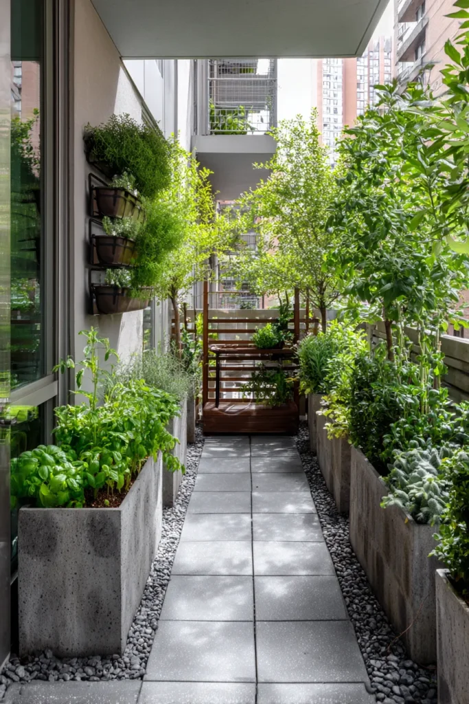 I think this design is absolutely brilliant for anyone who loves gardening but lives in an urban environment because it cleverly uses tall plants to create a living wall of privacy from neighbors. I especially love how the straight lines of the planters frame the pathway, making the entire balcony feel organized and intentionally designed rather than just a collection of pots. It is such an elegant and refreshing alternative to the typical furniture setup and feels like stepping into a peaceful hidden courtyard.