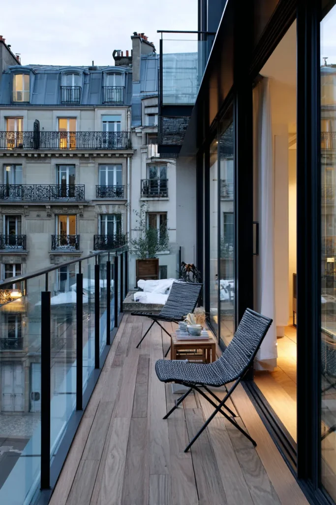I am absolutely in love with how incredibly chic and streamlined this look is because it proves you do not need lots of fuss to create a beautiful space when you have an incredible view. The glass railing is a genius move for making the balcony feel expansive and completely connected to the city surroundings, which is exactly what you want when living high above the rooftops. It feels so grown-up and luxurious and looks like the most perfect spot to have a quiet cup of coffee or an evening cocktail while watching the lights of the city turn on.