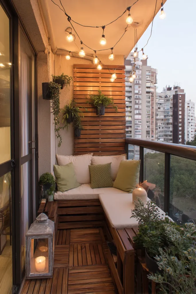 This gorgeous balcony maximizes every inch of its small footprint by utilizing vertical space with light wood paneling that creates a beautiful, warm backdrop. A custom-built seating bench made from wooden crates or pallets provides cozy, flexible seating and even a bit of hidden storage underneath. The whole area is softened with plush pillows in earthy greens and creams, while bistro string lights strung overhead cast a magical, inviting glow. A few potted plants and rustic lanterns complete this look, making it feel like a true extension of the living room.