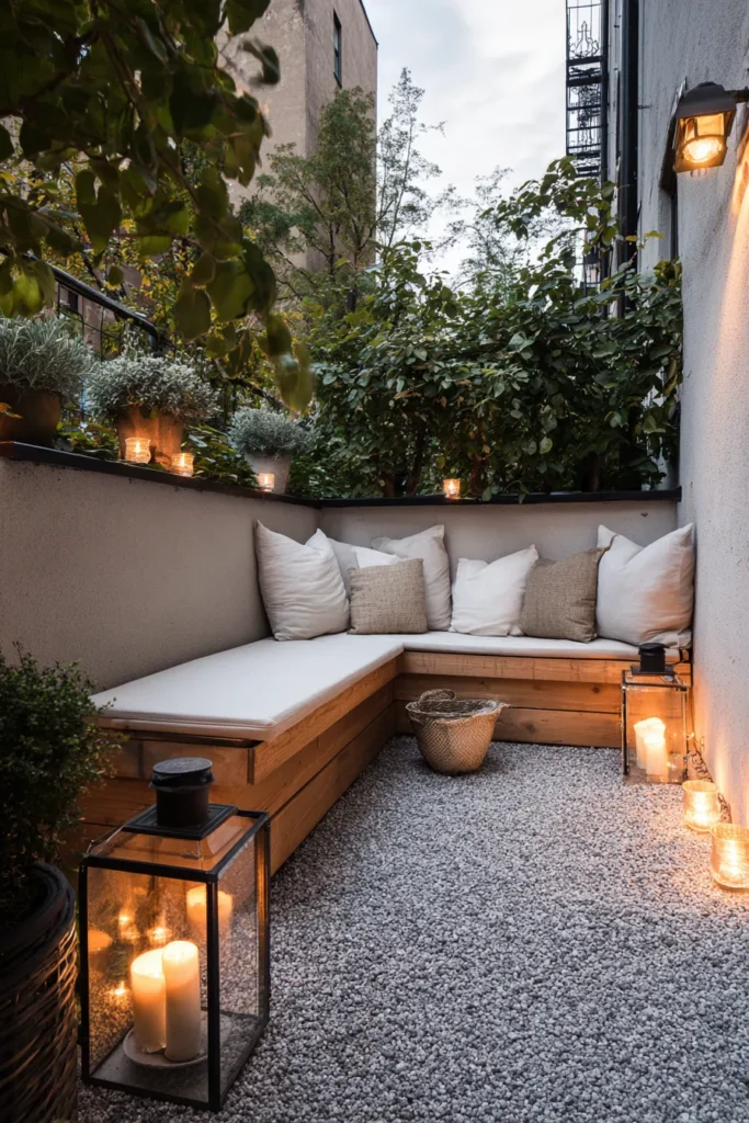 This design showcases how smart layout and texture can make a huge impact, transforming a simple corner into a bohemian lounge. The centerpiece is a custom L-shaped bench layered with thick, comfortable cushions and pillows in soothing neutral colors like cream and beige. Instead of traditional decking, the floor is covered in small, light-colored gravel, which adds a wonderfully tactile, natural texture. Tucked-in lanterns and lush, dark green privacy shrubs complete the intimate setting, creating a secluded feel despite being outdoors.