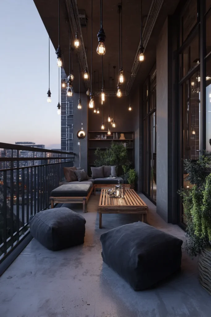 I am absolutely obsessed with how stylish and effortlessly cool this balcony looks because it perfectly captures that moody, metropolitan aesthetic that is so popular right now. The dark color palette is instantly sophisticated, and those huge, comfy beanbags look like the ideal place to sink into after a long day of work. It is such a fantastic example of using dramatic lighting and simple, comfortable furniture to create a chic, urban hangout space that feels like a private rooftop bar.