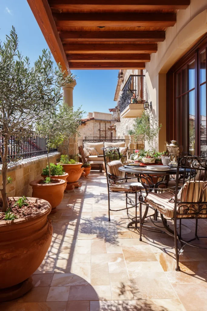 Gosh, everything about this patio is just pure perfection, from the warm tones of the wood ceiling to the abundance of natural light streaming in. I especially adore the huge terracotta pots with their beautiful aged look and how they make the entire balcony feel like a lush, established courtyard garden. It is the ultimate inspiration for creating a timeless, sun-drenched outdoor room that feels hundreds of miles away from the nearest apartment building.