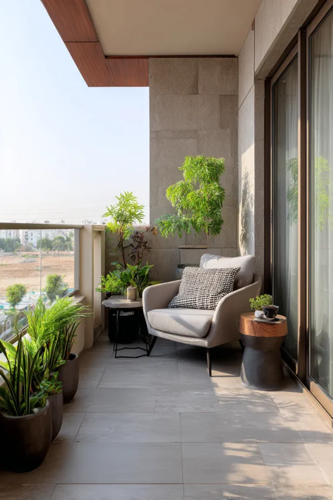 This inviting balcony strikes a beautiful balance between comfort and practicality, creating a serene outdoor oasis with a relaxed, neutral palette. The space is furnished with comfortable, woven chairs and a small side table, perfect for morning coffee or an evening read. Lush potted plants of varying sizes are strategically placed to add vibrancy and a touch of privacy, softening the urban backdrop. The floor is a light, natural-toned tile, keeping the overall feel airy and bright, while simple railings maintain an open view.
