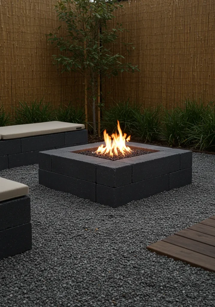 Modern Zen Fire Pit with Sleek Black Blocks and Bamboo Backdrop