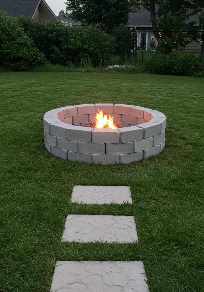 This fire pit keeps things sweet and straightforward. Built from light gray cinder blocks stacked in a perfect circle, it’s the kind of setup that feels like it’s always been there. Set right in the middle of a lush green lawn, a small path of stone pavers leads you straight to the warm, flickering glow. No fuss, no frills, just a cozy spot to gather and unwind.