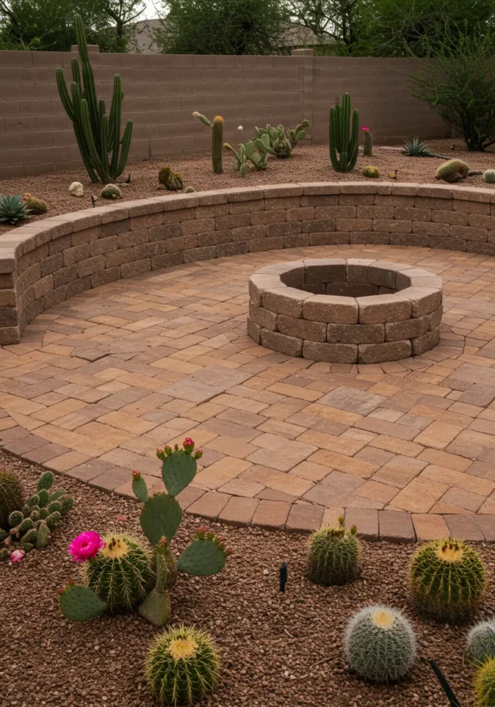 Desert-Inspired Fire Pit with Cactus Landscaping and Paver Seating