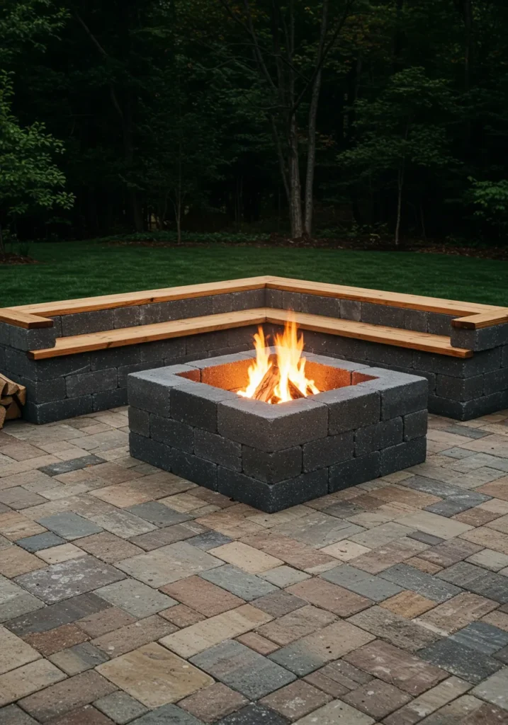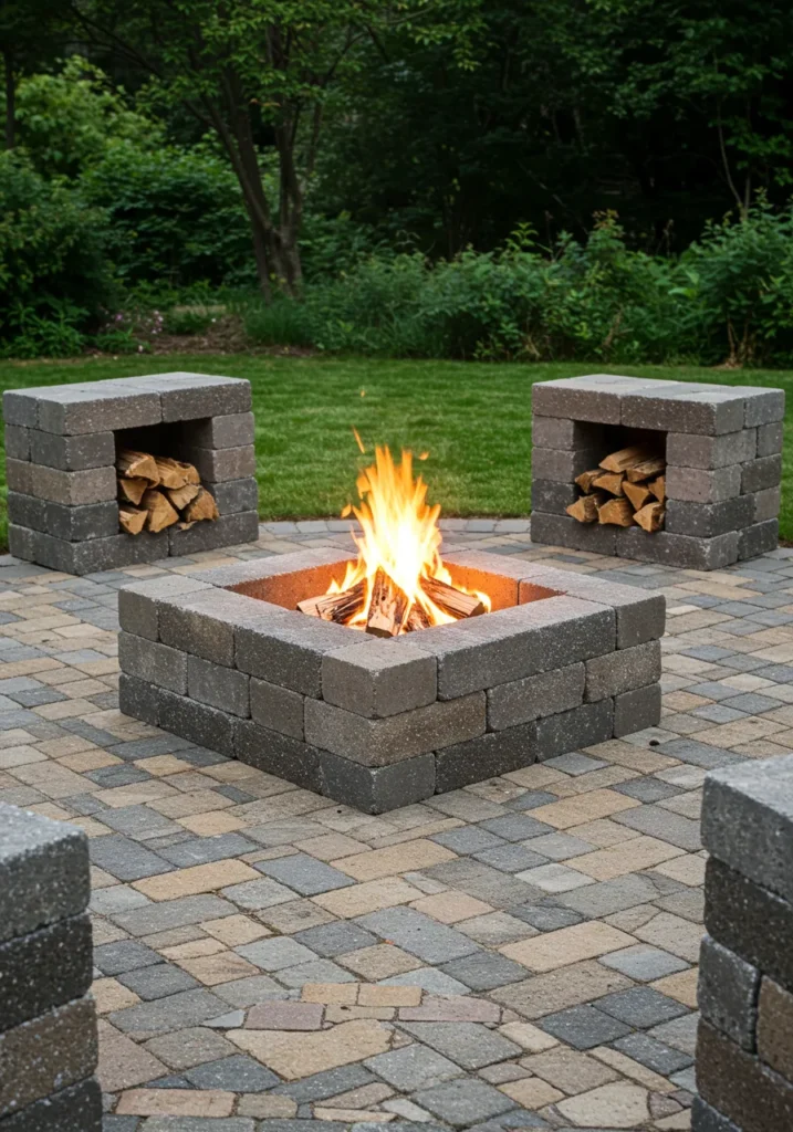 This backyard fire pit setup keeps things neat, structured, and oh-so-practical. The square fire pit is built from smooth charcoal-toned cinder blocks and sits on a tidy paved patio that feels both polished and homey. Around it are clever little block stools with open centers that double as built-in log storage. Talk about functional style.