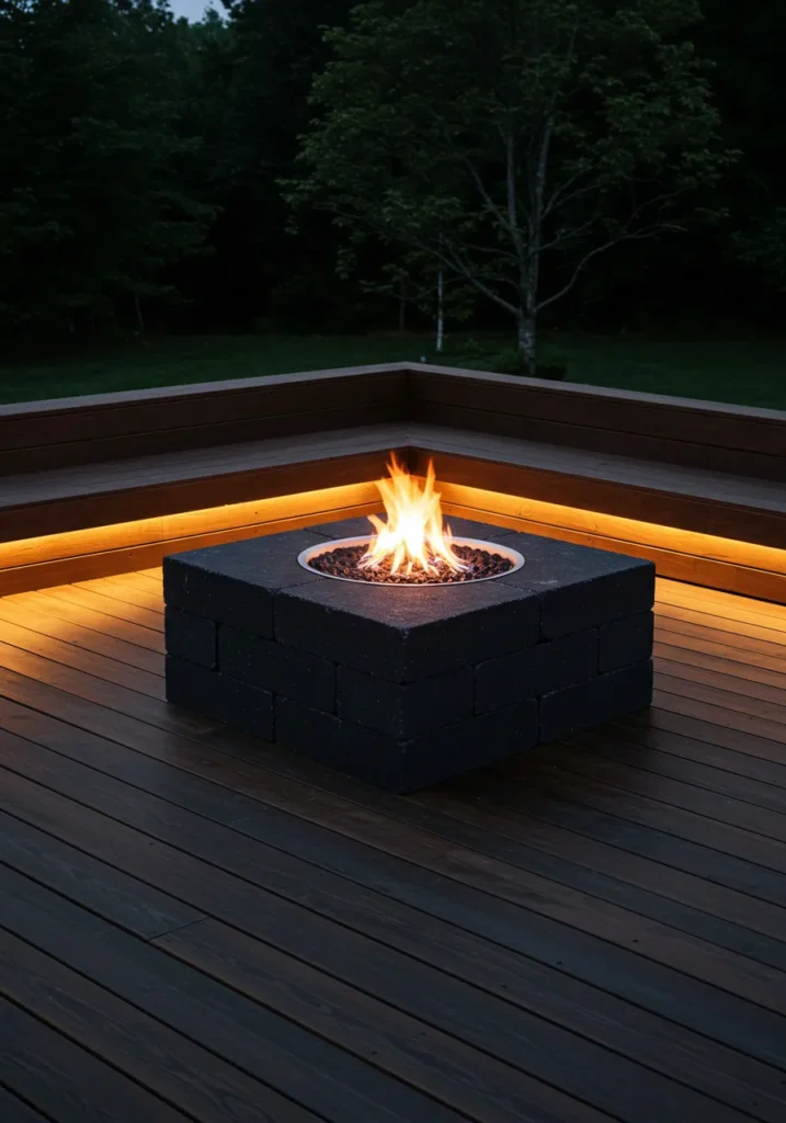 Sleek Deck Fire Pit with Ambient Lighting and Dark Cinder Blocks