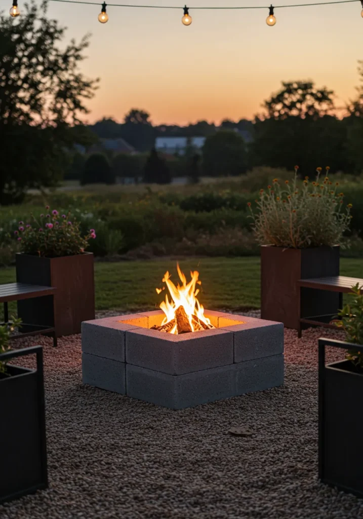 This cozy little fire pit setup is all about simple pleasures. The square cinder block pit is clean and compact, sitting on a bed of natural gravel that keeps things easy-going and low-fuss. It’s surrounded by sleek black benches with matching planter boxes at each corner, bursting with flowers and herbs. Overhead, string lights add a warm glow just as the sun dips below the horizon.