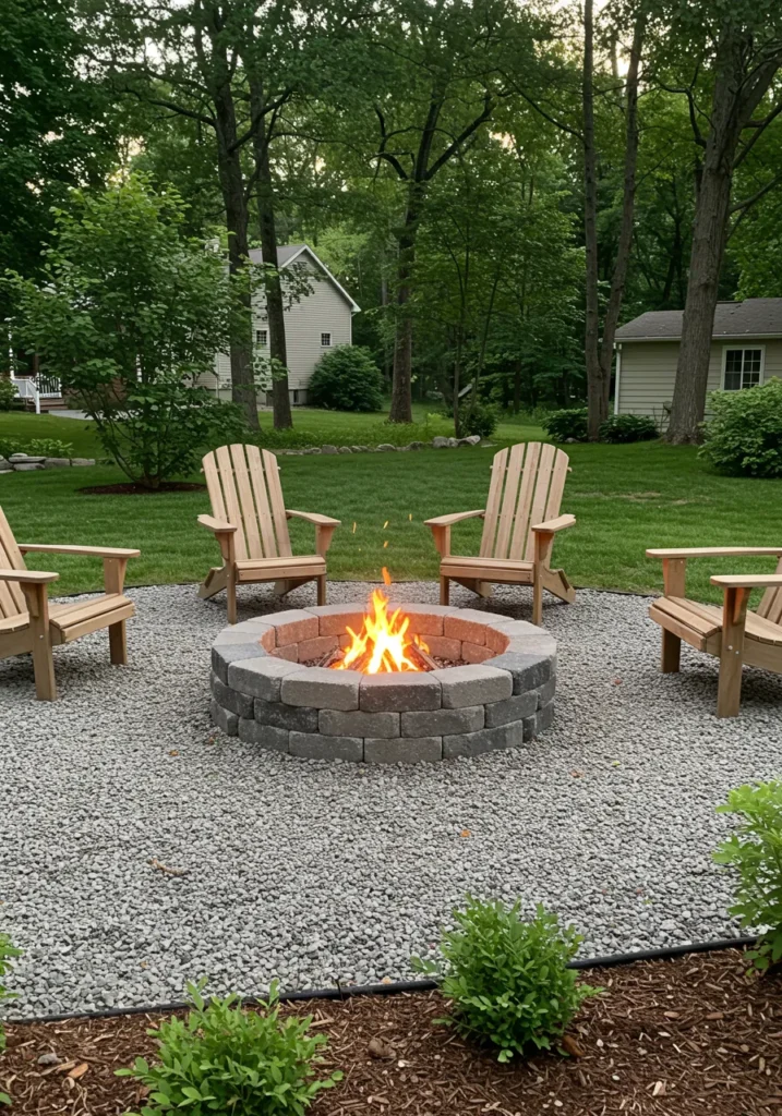 This setup is backyard perfection in its purest form. A round cinder block fire pit sits neatly in the middle of a gravel pad, surrounded by those timeless wooden Adirondack chairs we all secretly want to sink into. The fire glows softly, framed by trees, trimmed grass, and the cozy charm of neighboring homes in the distance.