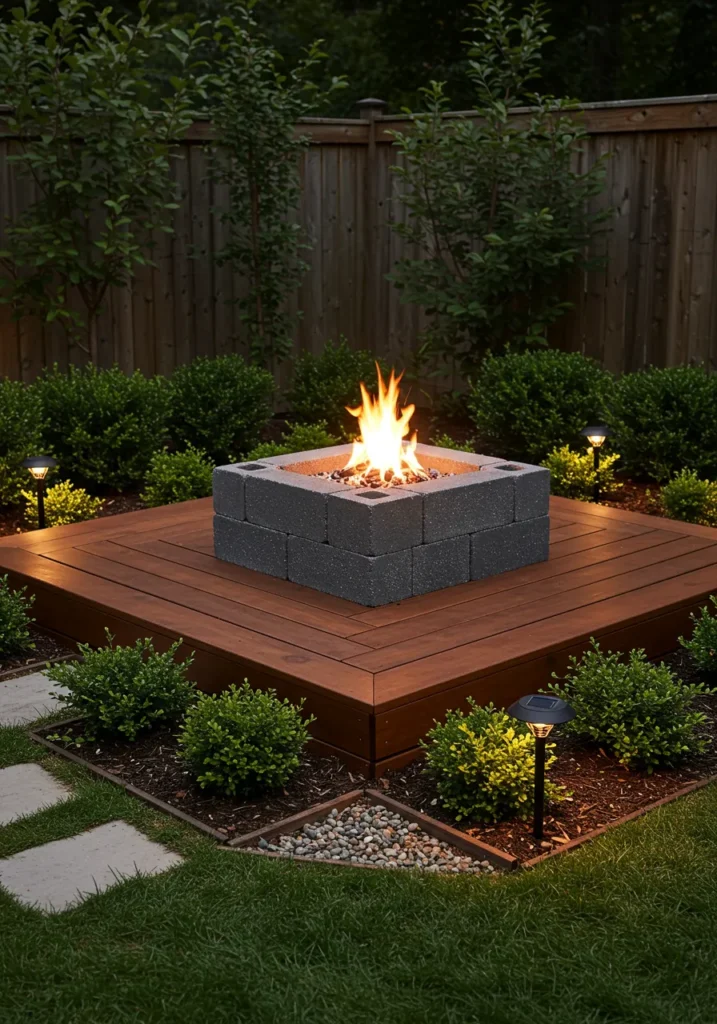 This backyard fire pit is tucked into a charming little stage of its own. Built on a rich wooden platform, the square cinder block fire pit stands out with clean lines and a glowing flame that becomes the heart of the whole space. It’s surrounded by neat garden beds filled with boxwoods and warm solar lights that softly glow as the sun sets.