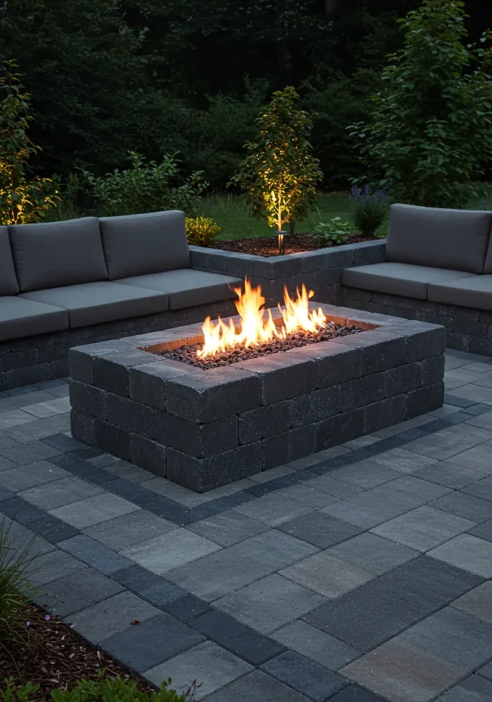 This backyard fire pit setup feels like an outdoor living room. The rectangular fire pit is built from deep gray cinder blocks and filled with glowing lava rocks, giving it a sleek, modern feel. Matching block benches topped with thick gray cushions wrap around the pit, creating a space that’s both structured and super cozy. Landscape lighting and neat paver stones complete the upscale look.