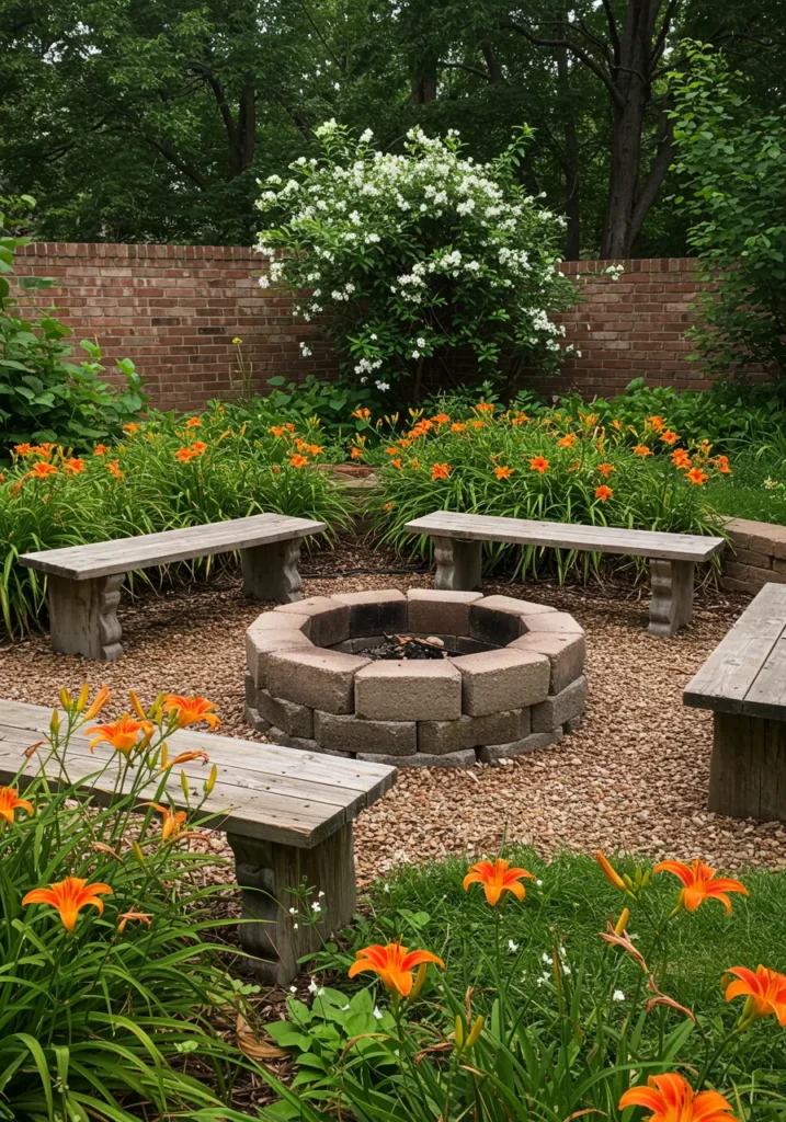 Cottage Garden Fire Pit with Wooden Benches and Daylilies