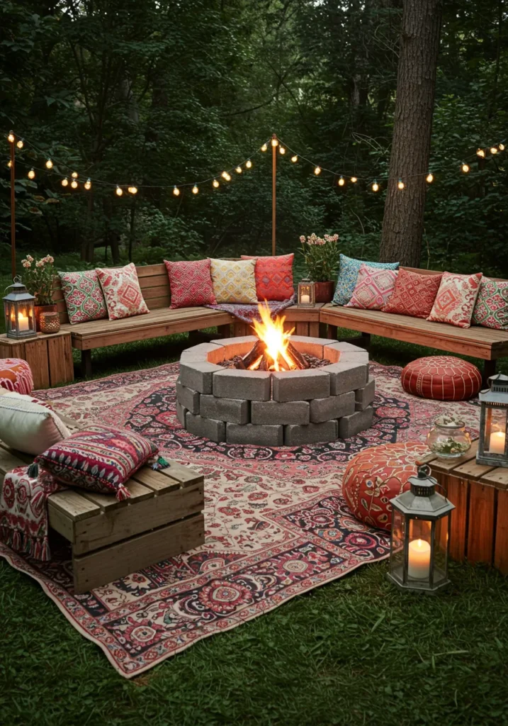 Boho Backyard Fire Pit with Patterned Pillows and Cozy Decor