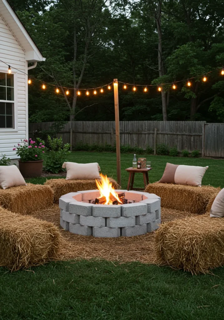 This cozy backyard setup brings all the farmhouse charm. The circular fire pit is made from soft gray cinder blocks, and instead of traditional chairs, the seating is made up of straw bales topped with comfy throw pillows. It’s rustic, relaxed, and just a little bit whimsical. String lights overhead complete the scene with that perfect golden glow.