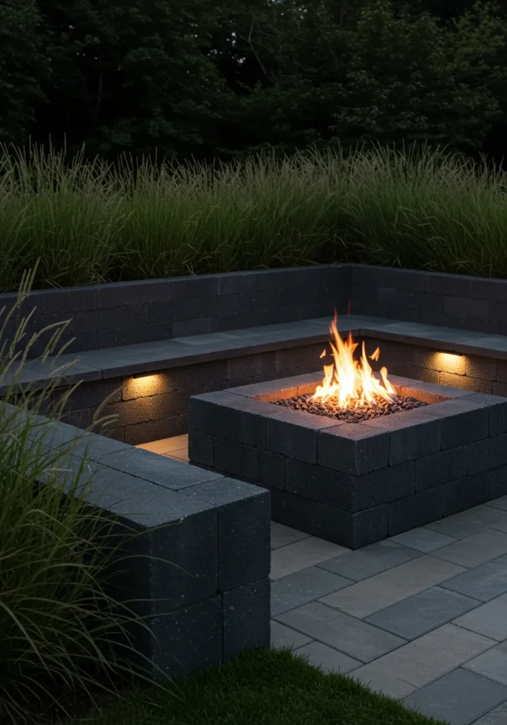 This backyard fire pit setup is sleek, structured, and full of quiet drama. The square cinder block fire pit sits at the center of a dark-toned paver patio, surrounded by matching built-in benches that feel like part of the landscape. Soft under-seat lighting adds just the right glow for nighttime hangs, while the tall grasses behind the bench give a natural, tucked-away feel.