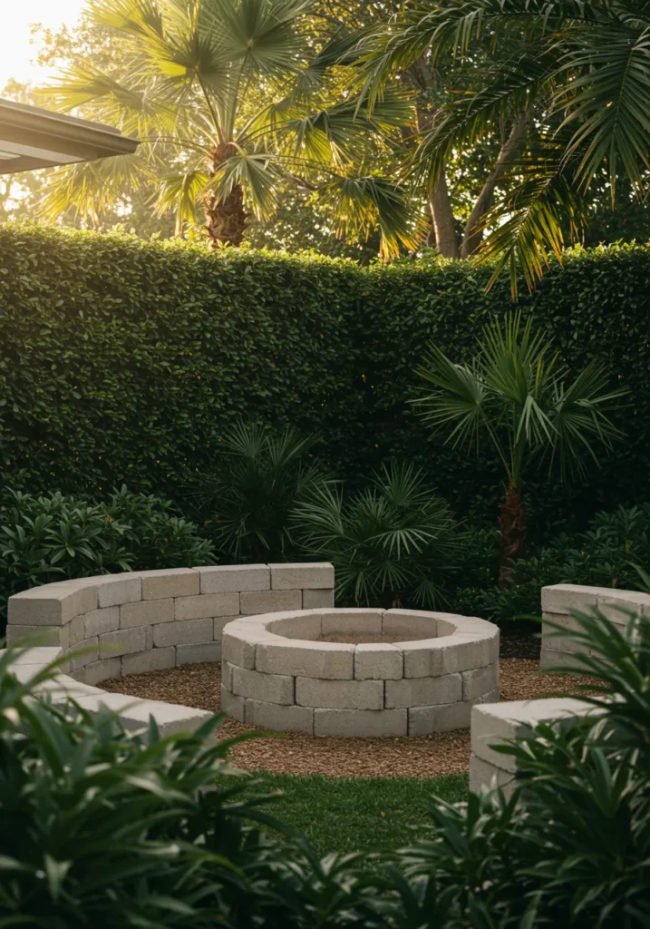 Tropical Garden Fire Pit with Curved Cinder Block Seating