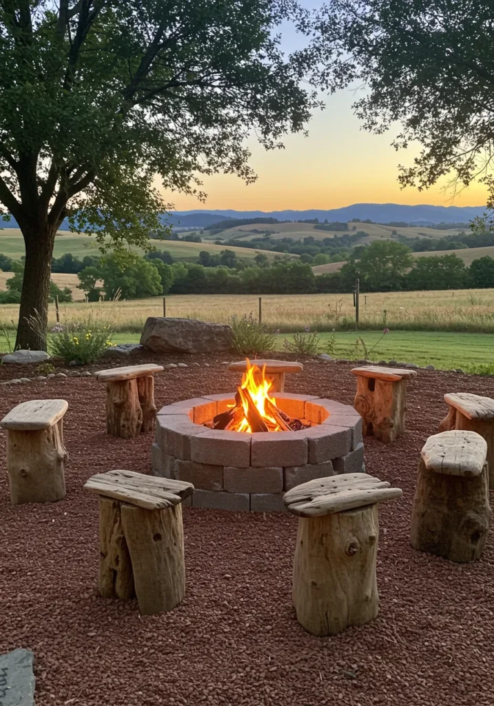 This fire pit setup is a countryside dream come true. The circular cinder block pit is perfectly placed on a bed of reddish gravel, surrounded by handcrafted log stools that are as charming as they are functional. And that backdrop? Rolling hills bathed in golden light, with a view that looks like it came straight off a postcard.