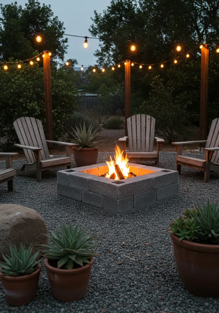This backyard setup blends rustic comfort with modern simplicity. The square fire pit is made from neatly stacked cinder blocks, its clean lines glowing warmly under the flickering firelight. Surrounding it, classic wooden Adirondack chairs offer the perfect place to settle in, while overhead string lights add that magical ambiance everyone loves once the sun dips.