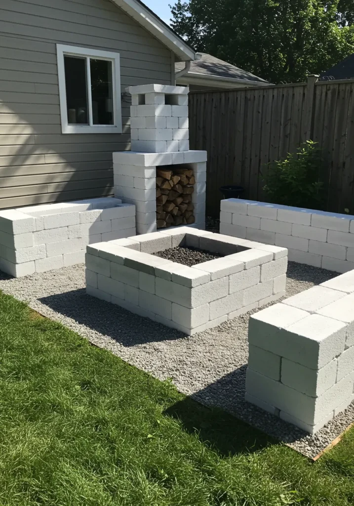 Minimalist Cinder Block Lounge with Built-In Fire Pit